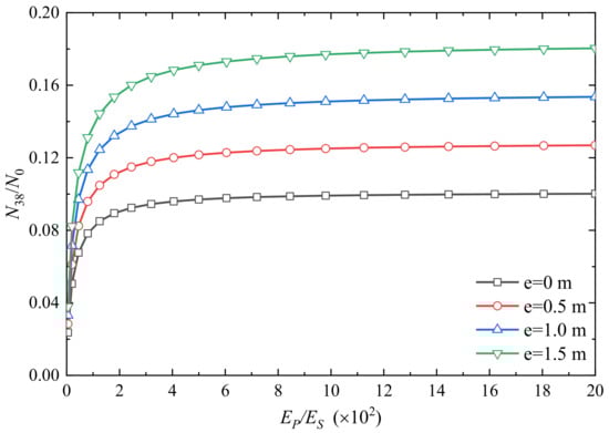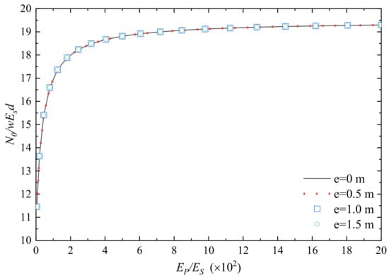 The effects of pile–soil modulus ratios Ep/Es on N0/wEsd, wd and N38/N0 with different eccentricity e are analyzed in detail, as shown in Figure 23, Figure 24 and Figure 25. These Ep/Es cover the range normally used in practice. As can be expected, the non-dimensional stiffness of a PRF, N0/wEsd, as the load is carried by the pile, should be increased with the Ep/Es, and the differential settlement wd should be decreased with the Ep/Es. The N0/wEsd−Ep/Es curves are identical for different eccentricity e. For each eccentricity e, N0/wEsd is about 13.64 when Ep/Es = 20, increasing to 18.81 when Ep/Es = 500, and increasing slowly to 19.30 when Ep/Es = 2000.