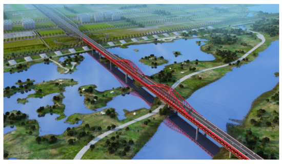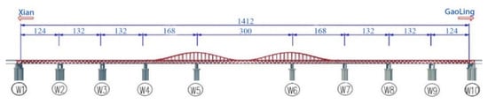 Figure 1, Figure 2 and Figure 3 are used to illustrate the specific details of the Weihe River Bridge. Figure 1 shows the schematic diagram of a cross-sectional structure, Figure 2 presents the layout of Weihe River Bridge span, and Figure 3 displays the overall view of the bridge.