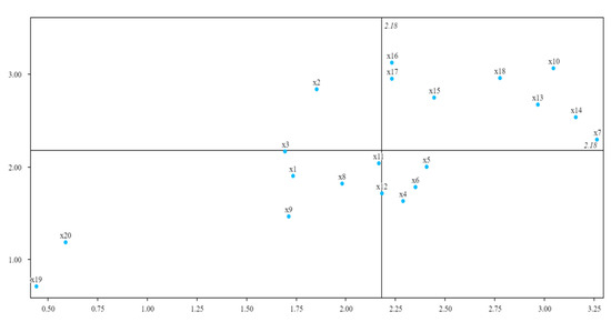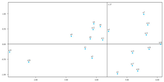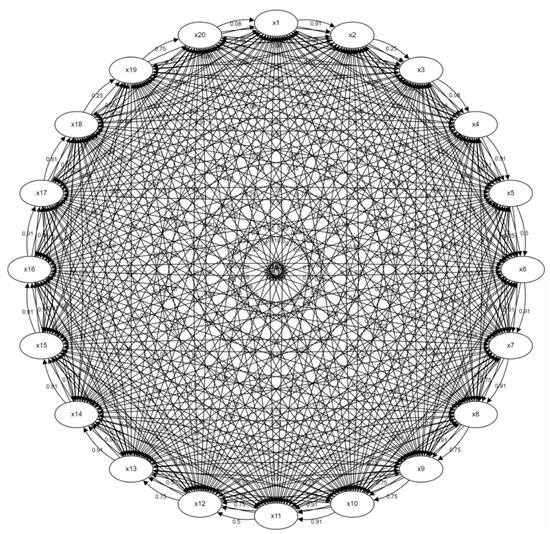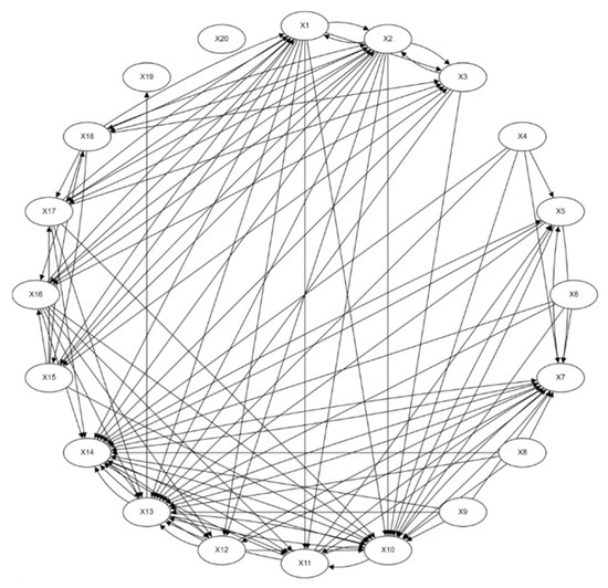 Reason degree is an important indicator for categorizing factor attributes. Factors with a reason degree greater than 0 are considered cause factors, while those with a reason degree less than 0 are regarded as result factors. According to Table 7, there are a total of 10 cause factors and 10 result factors. The top five factors based on reason degree are X20 (natural environment impact), X7 (collision with the pier when the guide beam is on the pier), X4 (stiffness and strength of the assembly platform), X14 (local buckling), and X12 (failure of the limit device). Factors with higher positive cause values are more likely to have an impact on other factors while being less susceptible to their effects. Therefore, it is necessary to pay attention to these factors during the construction process, focus on prevention and control, and proactively prevent the occurrence of safety accidents.