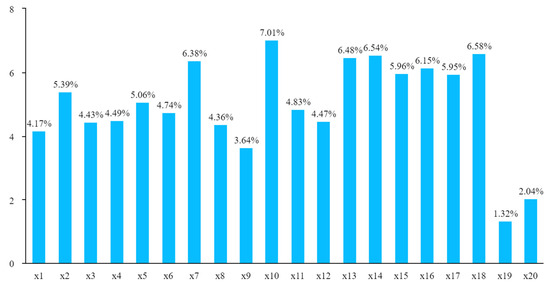 The comprehensive impact matrix was used to calculate the degree of influence, degree of cause, and centrality of each influencing factor according to Equations (6) and (8)–(10), as shown in Table 5. Figure 4 is Impact degree—affected degree graph. Figure 5 illustrates the centrality causality diagram. Figure 6 presents the comprehensive impact relationship diagram. Figure 7 provides the weight chart.