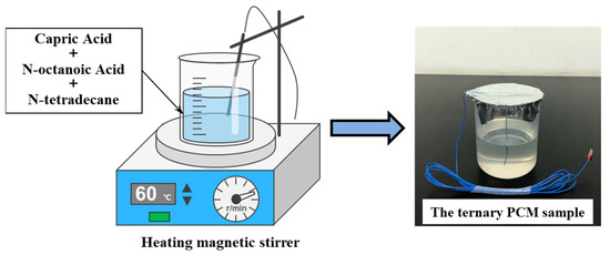 According to the data in Table 2, a specific quantity of capric acid and n-octanoic acid is measured and transferred into separate beakers. Then, the DF-101T constant temperature heating magnetic stirrer manufactured by Shanghai Lichen Bangxi Instrument Technology Co., Ltd. (Shanghai, China) is used to heat these two beakers to 60 °C. Subsequently, the heated capric acid is transferred into n-octanoic acid using a glass rod. Finally, the mixture is heated in a water bath at 60 °C and stir for 1 h to complete the preparation of binary PCM. After the above steps are completed, the quantitative binary PCM is heated according to the mixing ratio shown in Table 3 to 40 °C and transferred to n-tetradecane using a glass rod. Next, the mixture was continuously heated and stirred at 40 °C for 1 h to obtain a stable ternary PCM temperature measurement sample (as shown in Figure 1). During the preparation of all EPCM, the rotor speed of the magnetic stirrer was set to 1300 rpm [22].