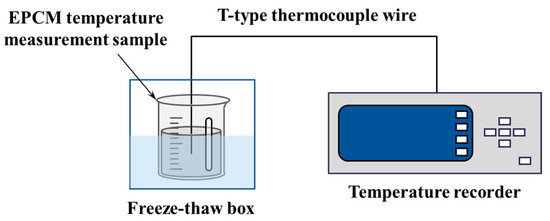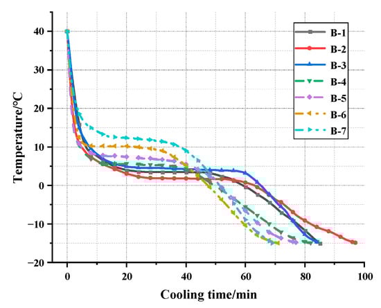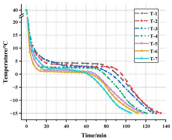 The cooling curve test is a method used to measure temperature changes during material cooling at a constant low temperature, which can easily and quickly compare the phase change temperature differences of EPCM under different composition ratios. This method can determine the composition ratio of the eutectic mixture at the lowest eutectic point in less time and at lower cost by reducing the frequency of DSC testing. Before the start of testing, for each EPCM groups, 200 g of sample is taken and placed in a plastic beaker. A T-shaped thermocouple wire is inserted into the center of the material to measure the temperature value, and the insulated aluminum foil tape is then used to secure the thermocouple wires and seal the beaker. All T-type thermocouple wires are calibrated in a 40 °C water bath according to the method described in reference [23]. Before installing thermocouples, one should collect a set of calibration data and complete secondary calibration after the experiment is completed to confirm consistency. After the prepared temperature test sample is heated in a water bath to 40 °C, it is then transferred to a TDR-28 rapid freeze-thaw box (manufactured by Gangyuan Testing Instrument Factory in Tianjin, China) for cooling. During the cooling period, a SH-X multi-channel temperature recorder was used to record the temperature fluctuations of all of the samples (as shown in Figure 2). The data collection interval is 15 s, and the phase change temperature value of the samples are taken as the average difference between five consecutive data points, ensuring that it does not exceed 0.1 °C [24].