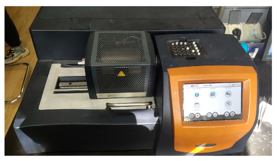 Differential scanning calorimetry (DSC) is a testing technique used to measure the amount of heat absorbed or released by a substance during its phase change process. In this article, the TA SDT 650 thermal analyzer (as shown in Figure 3), manufactured by TA Instruments, New Castle, DE, USA, is used for DSC analysis of EPCMs to obtain accurate thermal performance parameters, including melting point, crystallization point, and melting enthalpy, for each sample. Before the test begins, the DSC instrument is calibrated according to the method described in reference [25]. A total of 3 mg of indium is placed in an aluminum dish and sealed tightly. A stamped empty disk is added as a reference group. Two sets of samples are heated from 40 °C to 200 °C at a heating rate of 10 °C/min, and then cooled down to 100 °C at a cooling rate of 10 °C/min. During this period, the nitrogen volume flow rate is set to 50 mL/min. After repeating this process twice, the thermal parameter deviation and thermal parameter repeatability of the DSC instrument are calibrated based on the two scanning results of the reference material. At the beginning of the test, each sample is placed in a pure aluminum sealed dish and the container is filled with argon gas. Subsequently, the sample is gradually heated from an initial temperature of −30 °C to 30 °C at a heating rate of 5 °C/min. Finally, the sample is cooled to −30 °C at the same rate of temperature change and terminate the test. The DSC results are processed using the method described in reference [26] to obtain the accurate phase transition temperature and enthalpy of EPCM, and the accuracy of the results meets the requirements [27].