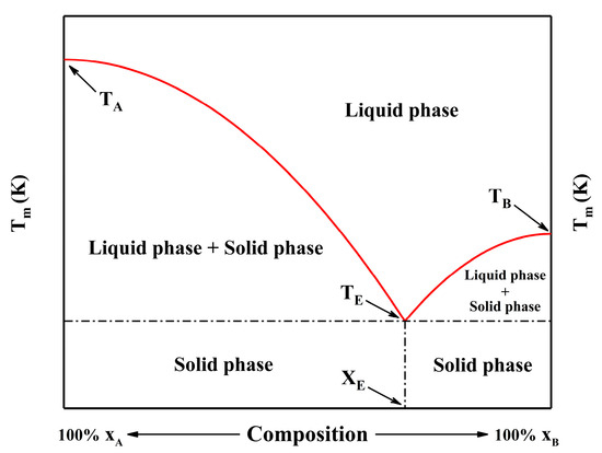 Generally speaking, the thermodynamic model of a multicomponent eutectic mixture can be described by the Gibbs solid-liquid equilibrium equation proposed in references [28,29], as shown in Equation (1):