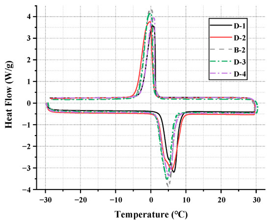 The results of the DSC test for binary PCM are shown in Figure 6. The peak with a negative heat flow value in the DSC curve represents the melting peak of the PCM, while the peak with a positive heat flow value indicates the crystallization peak. The melting point or crystallization point of a material can be obtained based on the intersection point of the tangent line of the peak and the baseline, while calculating the integral area between the peak and the baseline can obtain the melting enthalpy and solidification enthalpy of the material. The specific thermal performance parameters of the calculated samples are shown in Table 6. The test results show that within the range of 24~36% capric acid content, the melting point of the binary PCM shows a trend of first decreasing and then increasing, while the latent heat of phase change demonstrates a trend of first increasing and then decreasing. From this, it can be determined that when the mass ratio of capric acid to n-octanoic acid is 0.33:0.37, this type of binary PCM obtains the lowest eutectic point. At this point, EPCM has a minimum eutectic point of 1.42 °C and a minimum undercooling of 0.531, further indicating that the D-3 sample has the best eutectic effect.