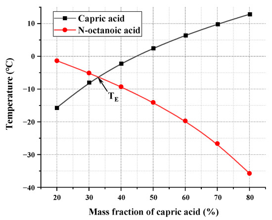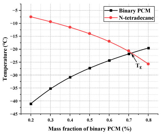 where is the phase change temperature of the eutectic mixture, (K); and represent the melting points of component A and component B, respectively, (K); represents the general gas constant, which is 8.314 J/mol·K; and are the molar fractions of component A and component B in the eutectic mixture, respectively, and ; and represent the melting latent heats of component A and component B, respectively, (J/mol). The principle of Equation (19) is that there is no chemical reaction between the components of an ideal eutectic mixture, only physical binding occurs. The higher the proportion of a certain component, the closer the final melting point of the eutectic mixture will be to that component.