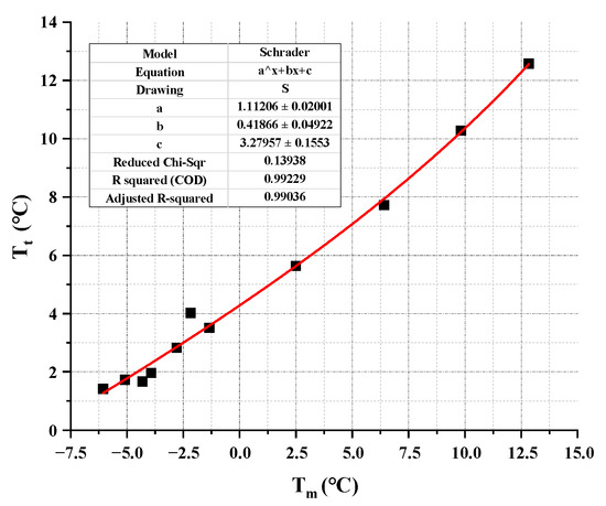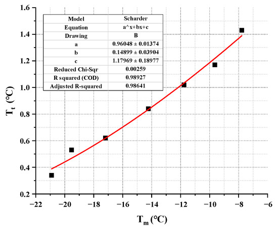 where is the predicted value of the corrected phase change temperature, (K); is the predicted value of the uncorrected phase change temperature, (K); , and are the parameters used to modify the equation; and the physical meanings of the other parameters are consistent with those in Equation (20). According to the measured phase change temperature Tt obtained, the predicted value Tm of the uncorrected phase change temperature can be fitted to obtain the corrected parameters. The parameter fitting diagram and fitting formula are shown in Figure 8 and Equation (22), respectively. The results show that the correlation coefficient R2 between Tt and Tm of binary PCM after data fitting is 0.99, indicating that the fitting accuracy meets the requirements.