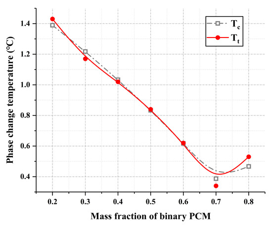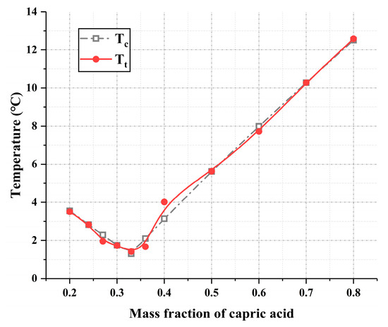 According to Equation (22), the corrected predicted phase change temperature Tc can be calculated, and the phase diagram comparison of Tc and Tt for binary PCM can be drawn (as shown in Figure 9). Additionally, to further verify the accuracy of the corrected predicted phase change temperature, a deviation coefficient is introduced to characterize the deviation between the experimental value and the predicted value [42]. The calculation formula is shown in Equation (23):