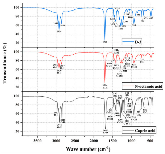 The FTIR spectra of capric acid, n-octanoic acid, and D-3 binary PCM.