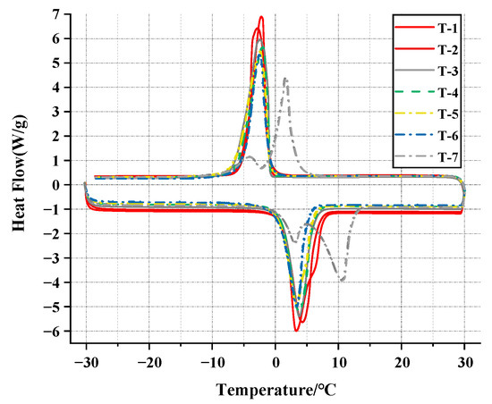 The DSC test results of the ternary PCM are shown in Figure 12, and the specific thermal parameters are given in Table 9. Firstly, it is worth noting that the DSC results of the T-7 sample show two peaks on the melting curve and crystallization curve, respectively. The weaker peaks are attributed to the solid-solid phase change process of the material, while the stronger peaks represent the result of the solid-liquid phase change process [44]. As an EPCM with a good co-melting effect, the internal components should reach a state of simultaneous melting and crystallization. Therefore, the sample should only show separate melting and crystallization peaks during DSC analysis. When the eutectic effect between components in EPCM is poor, it will lead to a certain degree of phase separation, dividing the original phase transformation process into two parts, making it difficult to fully release latent heat. Therefore, when mixing multiple EPCM components, the range of changes in composition ratio should be strictly controlled.