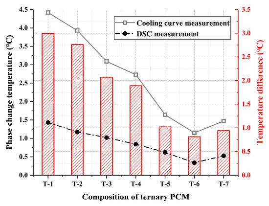 It is also worth noting that the phase change temperature of the ternary PCM measured by DSC is slightly different from that measured by the cooling curve test, and the comparison is shown in Figure 13. The phase change temperature measured by the cooling curve is generally higher than that measured by DSC, with a maximum temperature difference of 2.99 °C. The difference is due to the different principles of the two testing methods. The cooling curve test estimates the phase change temperature of the material through the platform temperature during the cooling process, while DSC testing can accurately measure thermal parameters such as material melting point, crystallization point, and melting enthalpy. However, to determine the lowest eutectic point of EPCM, conducting an overall DSC analysis is undoubtedly expensive and slow. Although the cooling curve method cannot obtain accurate thermal parameters of EPCM, it can quickly compare the phase change temperature of EPCM with different composition ratios, thus obtaining a rough minimum eutectic ratio more quickly and conveniently. And the T-2 group with the highest cooling time required in the step cooling curve, did not exhibit the highest latent heat value in DSC testing, which may be related to the efficiency of latent heat utilization and eutectic effect of each component in EPCM. The temperature control performance of EPCM cannot be determined solely based on the magnitude of latent heat, but also needs to be comprehensively evaluated in conjunction with other experimental results. Therefore, in the collection of the lowest eutectic point of EPCM and the evaluation of its temperature control performance, the cooling curve method should be combined with the DSC method to achieve more scientific testing results, higher testing efficiency, and lower testing costs.