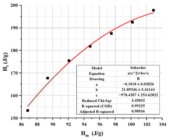 The experimental results in Section 3.2.2 show that the variation pattern of the latent heat value of the ternary PCM is not consistent with the melting point. More specifically, the latent heat value of ternary PCM does not reach the lowest value at a specific composition ratio such as the melting point, but rather exhibits a corresponding positive correlation with changes in the mass fraction of high latent heat components. Therefore, for the theoretical prediction of the melting latent heat of ternary PCM, a parabolic equation rather than an exponential model is used to make more appropriate modifications to the Schrader formula. The designed latent heat value prediction formula is shown in the Equation (25).