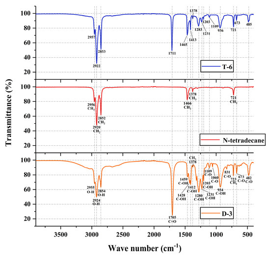 The FTIR spectra of D-3 binary PCM, n-tetradecane, and T-6 ternary PCM.