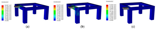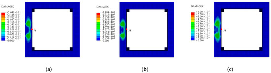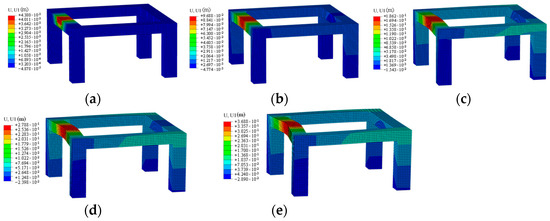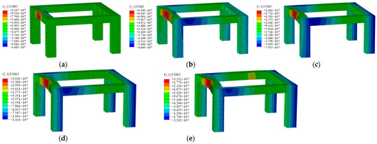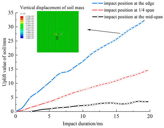 - The damage values and damage areas of the transmission tower foundation are different when the positions of the impactors are different. The damage value and damage area of the transmission tower foundation are the largest when the impact occurs at the quarter-span position, and the edge of the beam connected with the column foundation is the most seriously damaged, which means that this position is the weakest position of the transmission tower foundation. At the same impact time, the uplift value of unit node B is the largest when the impact occurs at the edge position, which means that an impact at the edge position has a significant influence on the deformation of the surrounding soil of the transmission tower foundation.