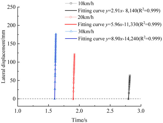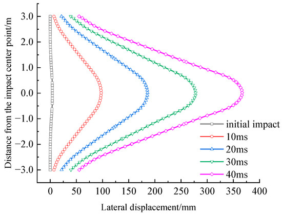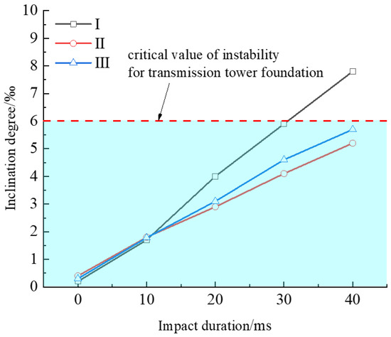 - With the increase of the impact duration, the lateral displacement curves of individual points along the longitudinal center line of the impacted connected beam move to the right continuously, and the lateral displacement values show a parabolic shape along the longitudinal center line of the connected beam. The inclination degree of the transmission tower foundation increases with increasing impact duration, which indicates that continuous impacting will seriously affect the inclination degree of the transmission tower foundation and even cause overturning failure.