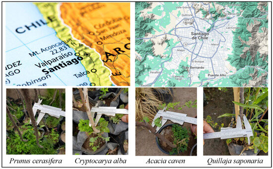 In light of the above, it is highly important to analyze the environmental behavior of urban tree species (in this case, one introduced and three native trees) frequently used in the Metropolitan Region of Santiago de Chile (represented in Figure 1) with respect to four variables: carbon dioxide (CO2) emissions and capture, PM2.5 particulate matter emissions and deposition, biogenic volatile organic compound (BVOC) emissions, and the water requirement and amount of rainwater.