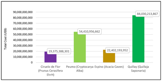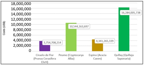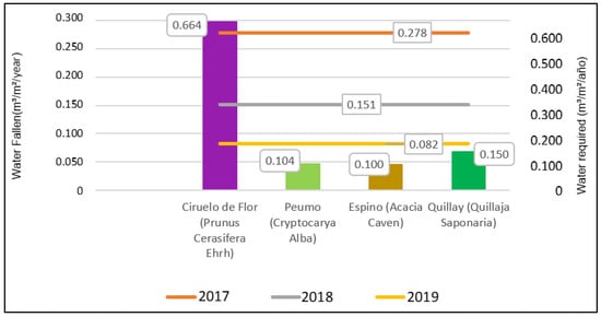 There have been droughts in Chile since 2007 [88]. To combat them, the government has implemented measures for the management of water resources [88,89,90]. The deficient management of water use [91] has increased the water stress in many areas of the country, requiring extensive technological management to reduce the costs of the resource in the long term [92]. An example of relevant management could be the use of ozone for treating gray water, which yields recovered water of a high quality for reuse [93,94,95,96]. This research used the parameter ‘Water requirement’ (m3/m2/year) to analyze the necessary amount of this resource according to each tree species and their consumption to reach maturity [80,97,98,99,100]. These data were contrasted with the amount of annual rainfall in the Metropolitan Region (m3/m2/year), which was obtained from the website of the Chilean Meteorological Directorate [101].