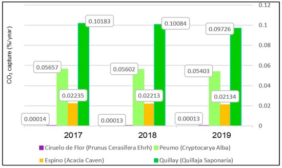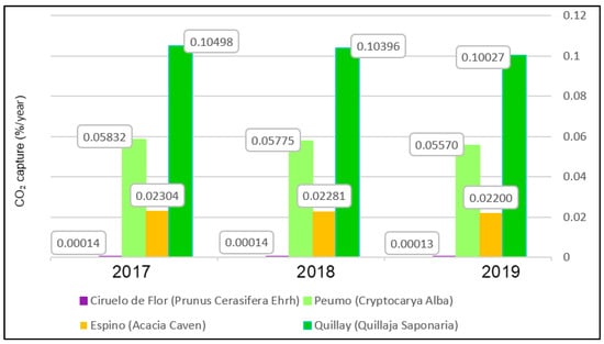 To help balance these levels out, we learned about the CO2 capture capacities of each species by using the following procedure, In the case of the introduced species (Ciruelo de Flor), we conducted an analysis in Ecuador Park in the city of Concepción [77] using its surface area, the number of individual Ciruelo de Flor trees and CO2 absorption capacity to establish proportional relationships and the absorption capacity of this gas that the city of Santiago could have; for the other species, we analyzed a native forest [78].
