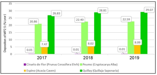 We obtained the deposition capacity of Ciruelo de Flor from the analysis carried out in Ecuador Park [77] and of the other species from a report carried out in the research region [87]. The information collected is shown in Table 5.