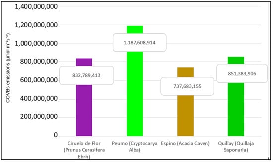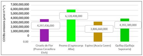 Emissions of Biogenic Volatile Organic Compounds, BVOCs, emitted by a tree of each species measured at two different times on each day of spring (sources: biogenic volatile organic compounds from the urban forest of the Metropolitan Region, Chile [66]; emission factors of biogenic volatile organic compounds in various stages of growth present in the urban forest of the Metropolitan Region, Chile [66]).