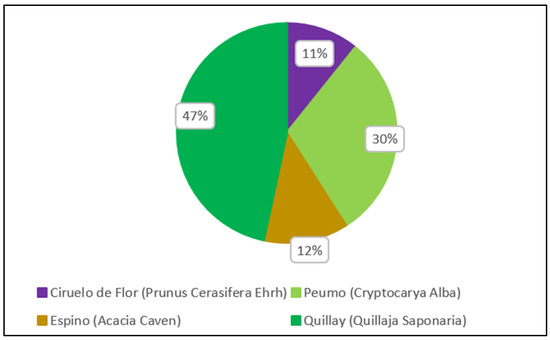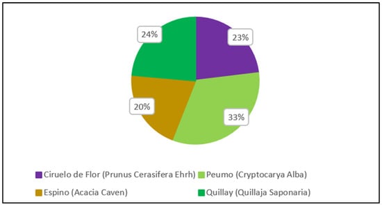 The introduced species with deciduous leaves and edible fruits and which is currently the most used species in the city is Ciruelo Flor (Prunus cerasifera Ehrh) [74]. The others are native: Peumo (Cryptocarya alba) and Quillay (Quillaja saponaria), with perennial leaves, and Espino (Acacia caven), with deciduous leaves and less foliage [74]. Although they cannot compete in regard to quantity with the first species, they are readily available on the market.