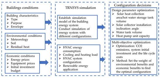 In recent years, near-zero-energy buildings have become increasingly popular among researchers and developers owing to their lower energy consumption. Lower energy consumption implies more accurate equipment selection and more refined system control. In order to optimize the key design parameters and system configuration of a building’s air conditioning system and study the optimal system configuration scheme of the air conditioning system under different weights of economic benefits and environmental benefits, our study considers a near-zero energy office building in Beijing as an example and uses TRNSYS to simulate the performance of different HVAC system configurations. A new evaluation index was established using the solar energy guarantee rate and operating energy consumption. Based on the Taguchi method, the degrees of influence of the four factors affecting the evaluation index were ranked. The influencing factors were the solar heat collection area/hot water storage tank volume (A/V), heat pump unit capacity, constant-temperature water tank volume, and solar collector installation inclination angle. The best parameter combination was found to optimize the system. By comparatively analyzing the operating characteristics of the system under different system configurations, a multi-objective optimization function was established that optimized the life cycle costs of the HVAC system and carbon emission levels during operation, and the optimal configuration scheme under different weights was obtained. The flowchart of the optimization processes is shown in Figure 1. This provides a reference for design research on the optimal configuration of HVAC systems in near-zero-energy buildings.