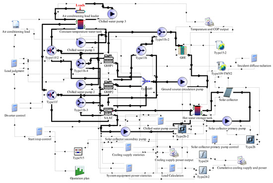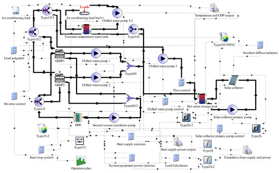 According to Table 2, there were two types of heating operation strategies in the winter: 1. When solar radiation was sufficient, the solar thermal collection system was preferred for direct heating, and the ground source heat pump system was the backup heating system. 2. Single-ground source heat-pump system for heating. There were two types of cooling operation strategies in the summer: 1. Priority was given to operating the ground source heat pump and absorption refrigeration unit, and the second ground source heat pump unit was turned on when the cooling demand could not be met. 2. Single-ground source heat-pump system for cooling. TRNSYS [21,22] was used to build system simulation models under heating and cooling conditions, as shown in Figure 2 and Figure 3, respectively. The special feature of TRNSYS is its modular analysis method. TRNSYS can call modules that implement specific functions. Under given input conditions, these module programs can simulate a specific heat transfer phenomenon and summarize the data to conduct instantaneous simulation analysis of the entire system. In Figure 2 and Figure 3, the components connected by solid lines are the equipment of the HVAC system, and the components connected by dotted lines are the programs used to control, calculate, input, and output data.