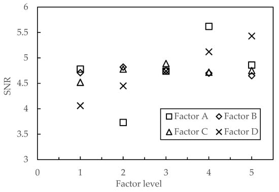 The Taguchi method uses the signal-to-noise ratio (SNR) to reduce the impact of uncontrollable factors on the experimental dependent variables and selects the optimal parameter combination with a smaller number of experiments. This study adopted larger-the-better characteristics; that is, the larger the characteristic index, the better. The SNR with larger-the-better characteristics was calculated according to Equation (10) [25]: