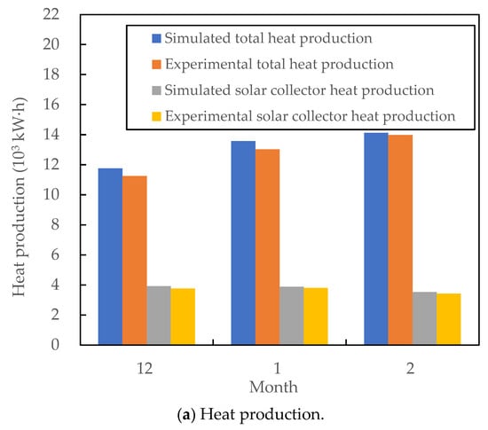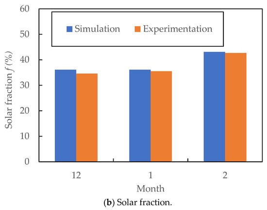 The experimental operation results of the GSHP + SCS system from December to February of the following year were compared and analyzed with the model simulation results. The results are shown in Figure 5. Figure 5a shows that the deviation between the experimental solar collector heat production and the simulation in December was 4.88%; the deviation in January was smaller, 1.58%. The deviation between the experimental total system heat production and the simulation in December was 4.31%, and the deviations in January and February were 4.15% and 2.60%, respectively. Figure 5b shows that the average deviation between the experimental solar fraction and the simulation during the comparison period was 2.87%, and the deviation in January was larger, 4.29%. The deviation of all operating effects between the simulation model and the experimental system was less than 5%, which indicated that the simulation model was sufficiently accurate.