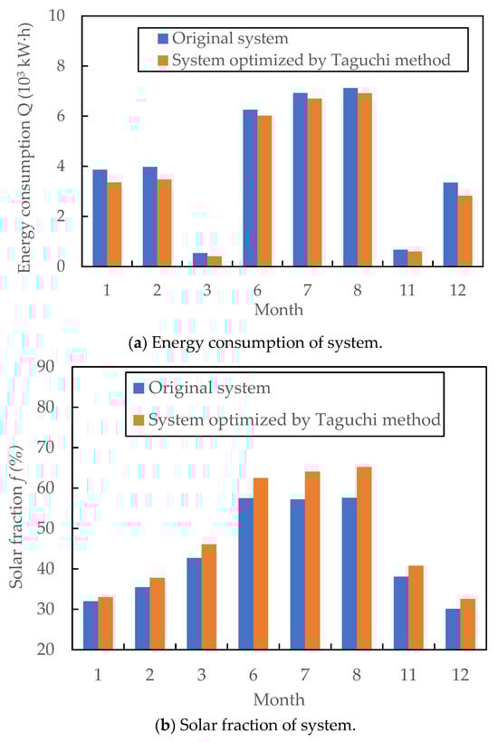 The simulation model established by TRNSYS was used to simulate and analyze the annual energy consumption of the HVAC system. In summer, the system used the GSHPS for cooling and the SCS handled part of the domestic hot water load. In winter, the GSHPS and SCS jointly provided heating. The indoor temperature was set to 26 °C during the cooling season and 18 °C during the heating season, with temperature fluctuations of ±1 °C. During the working hours of 6:00–18:00 in the cooling and heating seasons, the simulation model determined the operating status of the HVAC system according to the input meteorological parameters and physical characteristics of the building model. Figure 6a,b shows the system operating energy consumption and solar energy guarantee rate during the heating and cooling seasons before and after the system was optimized using the Taguchi method. For the program to function properly, it is necessary to ensure that the building cooling and heating load requirements are met, and it can be observed that the solar guaranteed rate of the optimized system under this condition increased by 4.6% on average. The reduction in the installation inclination angle of the solar collector reduced the useful heat gain from the solar energy, thereby increasing the operating energy consumption of the system. Therefore, the operating energy consumption of the system decreased slightly from June to September. The annual operating energy consumption of the system was reduced by 7.32%. It should be noted that in March, which is the transitional month, the building air conditioning load was very small. Free solar heating could be achieved when the temperature of the solar hot water was higher than 45 °C and the GSHP unit was not started at this time. November is also a transitional month and its working conditions were similar to those of March. Therefore, the start-up time of the GSHP unit was shorter in these two months, and the energy consumption of the system was lower than in the other months.