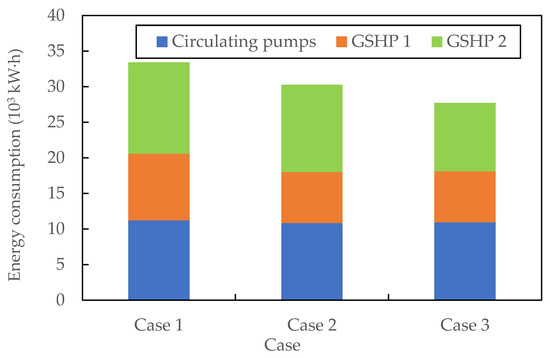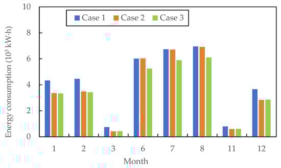 The annual system energy consumption of the three system solutions in Table 2 was compared. Figure 7 shows a comparison of the total energy consumption of the three cases and their main energy-consuming equipment. Figure 8 shows a comparison of the monthly energy consumption of the three cases. Compared to Case 1, which completely adopted GSHPS for heating and cooling, the total energy consumption of Case 2 was reduced by 3121 kW ·h, accounting for 9.3%. The energy consumption of the pumps, GSHP 1 was reduced by 23.5%, and GSHP 2 was reduced by 3.6%, 23.5%, and 4.3%, respectively. The total energy consumption of Case 3 was reduced by 5677 kW·h, accounting for 17.0%, of which the energy consumption of the water pumps was reduced by 2.7%, the energy consumption of GSHP 1 was reduced by 23.6%, and the energy consumption of GSHP 2 was reduced by 25.8%. For a nearly zero-energy building in Beijing, solar thermal heating had better energy-savings benefits owing to the large heat load. Because the start-up of the absorption refrigeration unit required a high hot water temperature, the energy-savings benefits of solar-driven absorption chillers during the cooling season were lower than those of solar heating during the heating season.