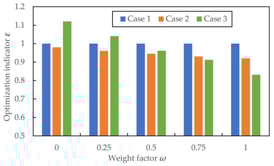 Taking the near-zero energy building energy system investigated in this study as an example, a multi-objective optimization analysis was performed. The weight factor ω has values between 0 and 1, and the ε value for each case was calculated. Figure 10 shows the simulation results.