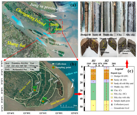 Due to the growth of the economy and the burden of a growing population, land resources are gaining importance for coastal cities. To expand living and development space, many coastal countries or cities choose land reclamation projects, which offer the advantages of low cost and fast speed. In most cases, some cities use the sediment and waste soil near ports or waterways as potential reclamation materials to dispose of them in environmentally friendly method. This not only helps to reduce costs, but also contributes to achieving sustainable development [1,2]. As these reclamation materials are usually pumped to the designated location in the form of mud, the resulting hydraulic fill sediment usually has the engineering properties of soft clay and is highly compressible in the initial sedimentation stage, defining it as a typical soft soil [3]. In this context, if large-scale civil engineering projects are to be constructed on reclamation sites, the soft soil foundation must be strengthened prior to construction to increase the bearing capacity of the foundation. As a typical multi-level reclamation area in Shanghai, Chongming East Shoal (CES) has implemented multiple reclamation projects since the last century. According to Shanghai land management and field investigations, newly reclaimed land can be used for engineering construction after a certain level of development [4,5]. In this regard, it is crucial to minimize the settlement of infrastructure facilities in the reclamation area after construction.