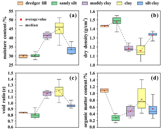 In this study, the basic properties of these soil samples, including the natural moisture content, dry density, porosity, and organic matter content, were tested according to the Standard GB/T 50123-2019 soil-testing method [38], as shown in Figure 2a–d. The water content of dredger fill and sandy silt were similar, ranging from 27.98% to 32.46%, whereas that of the USC ranged from 31.3% to 51.17%. The dry density of dredger fill and sandy silt ranged from 1.44 g/cm3 to 1.55 g/cm3, whereas that of the USC ranged from 1.20 g/cm3 to 1.41 g/cm3, indicating that coarse-grained soils tend to be more tightly packed than fine-grained soils. The variation pattern of the pore ratio and the natural water content is similar, with the porosity of dredger fill and sandy silt ranging from 0.74 to 0.91, and that of the USC ranging from 0.95 to 1.39. In addition, the organic matter content of each soil layer was less than 1.5%, with the dredger fill having a slightly higher organic matter content, indicating that the complex composition of dredger fill and its diverse sources provide a certain organic-matter accumulation environment.