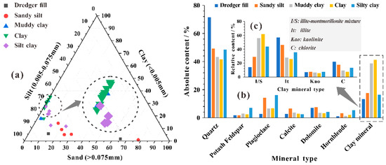The grain size distribution was determined by using a laser particle-size analyzer (BT9300LD) as described by [39]. The particle-size classification referred to the Standard GB/T 50123-2019 soil-testing method [38]. In all soil samples, the proportion of silt was highest, followed by that of clay (Figure 3a). As a natural sedimentary soil layer with a longer history, USC has a more stable particle-size distribution than dredger fill and sandy silt. Referring to the SY/T 5163-2010 Standard [40], the K-value method was used for the quantitative analysis of XRD, and the results are shown in Figure 3b,c. The quartz content in each soil layer dominated (>45%), while the content of other primary minerals was generally less than 10%. Secondary clay minerals were mainly illite-mixed layer and illite, with small amounts of kaolinite and chlorite. The widespread deposition of chlorite reflects a marine sedimentary environment [41].
