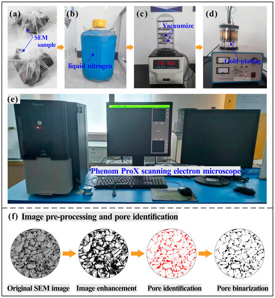 A scanning electron microscope (Phenom ProX) was used to observe the microstructural characteristics of the soil samples (Figure 5e). To reduce the volume and microstructural changes caused by water loss, the samples required a freeze-drying pre-treatment (Figure 5a–c). After that, a thin layer of gold was sputtered onto the sample surface (Figure 5d) to improve the image quality.
