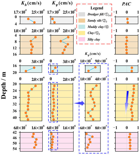 Based on the Kh and Kv results, the PAC was calculated using Equation (3), as shown in Figure 6. The nonzero value of the PAC for each soil layer implies the presence of permeability anisotropy in these soil layers. The average PAC values of dredger fill and sandy silt, muddy clay, clay, and silty clay are 0.068, −0.023, 0.475, 0.515, and 0.279, respectively, indicating that the permeability anisotropy of USC is relatively prominent. On a macroscopic scale, the layered sedimentary cracks and the horizontal distribution of thin sand layers between the soil layers in USC may be a major reason for the higher Kh than Kv values (Figure 1d). In addition, for the thickest clay layer, the PAC generally decreases with the burial depth increases, which means that the dominance of Kh gradually weakens. Similar findings were reported by Li and Zhang [46]. They observed that with an increase in vertical stress, fine particles within the clay progressively infiltrate the macropores, resulting in their initial destruction or complete disappearance. Hence, the compacting effect of the upper layers on the soil beneath can weaken the permeability anisotropy of the soil in both horizontal and vertical directions.