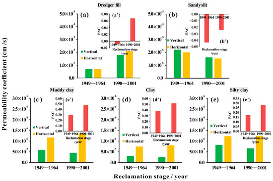 Land reclamation has had multiple effects on the sedimentary environment of underlying soil layers [47]. Therefore, comparing the permeability differences of different layers during different reclamation periods can help to further understand the spatial and temporal variability of soil permeability characteristics and their relationship with permeability anisotropy. Figure 7a’–e’ show the PAC changes in the soil layers for the inland borehole profile (1949–1964) and the nearshore borehole profile (1990–2001). The PAC calculation involves using the average Kh and Kv values for each soil layer. It is noticeable that the PAC of the same-depth soil layer in the early reclamation is generally smaller, which is more evident for USC. Ma et al. [48] suggested that strong sedimentary environment differences lead to significant permeability anisotropy of the soil in different directions, and the increase in pore connectivity in the vertical direction due to particle densification is the primary cause of the weakening of the permeability anisotropy. Song et al. [49] suggested that the decrease in permeability anisotropy of the same soil layer is related to the flocculent structure formed by the sedimentation process of the soil itself. In fact, due to the loose arrangement of particles in dredger fill and sandy silt, water infiltration in the soil pores under complex geological conditions is stochastic, and vertical and horizontal pores provide almost equal conditions for water flow. However, USC originates from layered sedimentation. Influenced by sedimentary environment and artificial fill loads, the increase in overlying soil pressure makes it easier for pores to be compacted horizontally than vertically. Consequently, as the sedimentation time of USC increases, the decrease in Kh becomes more prominent, and the permeability anisotropy weakens (Figure 7a–e).
