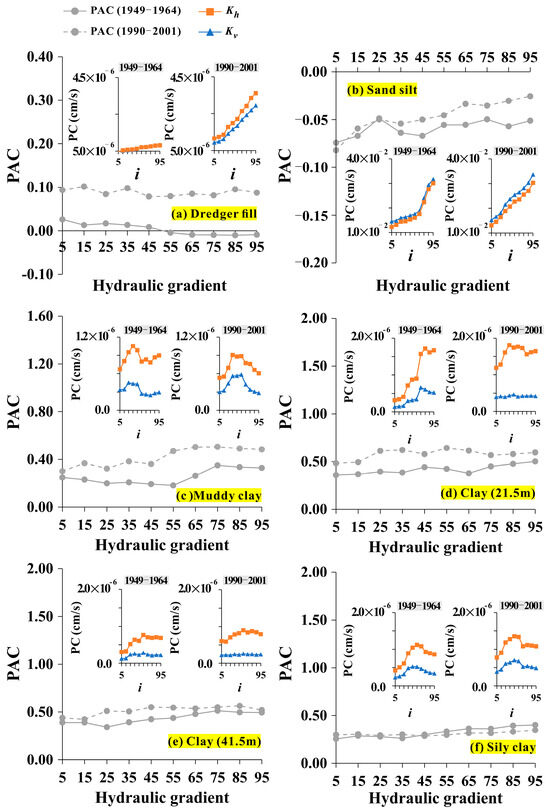 As the burial depth of soil varies, the height of the water pressure it is subjected to also varies. Therefore, it is imperative to explore the relationship between the permeability anisotropy of each soil layer and the hydraulic gradient. Figure 8 displays the fluctuations in the PAC with regard to hydraulic gradients. In detail, as the hydraulic gradient increases, the PAC of the nearshore dredger fill fluctuates between 0.088–0.093. However, the PAC of the inland dredger fill decreases, indicating that Kh and Kv are gradually approaching each other (Figure 8a). When i > 55, the PAC of the inland dredger fill becomes negative, indicating that as the hydraulic gradient exceeds a certain critical value, the vertical permeability of the inland dredger fill gradually becomes dominant. For the sandy silt, the PAC of the nearshore is higher than that of the inland. Apart from a small reduction in the inland PAC in the range of 25–35, the PAC of both the nearshore and the inland generally increases gradually with an increasing hydraulic gradient (Figure 8b). The PAC of muddy clay, clay, and silty clay shows a similar pattern with the hydraulic gradient, that is, when the water head increases, the PAC generally shows an increasing trend (Figure 8c–f). However, there is a fluctuating pattern in the PAC increase trend for USC, which could be due to the instability of permeable channels caused by the infiltration process [50]. Interestingly, when i > 45, the PAC of inland silty clay is higher than that of nearshore silty clay. This could be caused by the mixed components of the silty clay, such as the interbedded silt layer in the silty clay layer (Figure 1d); the different soil properties result in varying permeability.