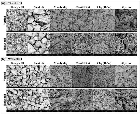 Silty clay, as the soil layer with the highest burial depth, also had strong permeability anisotropy, which was similar to that of muddy clay and clay. It was not difficult to see that, compared with the vertical direction, the obvious locally banded penetrating cracks in the horizontal direction were the key factor for its obvious permeability advantage in that direction. In addition, the contact modes of the particles were edge–surface and surface–surface contact, with visible intergranular pores and intragranular pores.