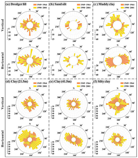 The directionality of particles has a significant effect on the permeability of soil [52]. To characterize the particle orientation of each soil layer sample, the IPP6.0 software was used for microscopic image processing. The particle orientation was divided into 18 groups, with a counting interval of 10°, to draw a rose diagram, as shown in Figure 10. When the frequency of a certain interval is higher, it indicates that more structural units have similar directionality, and the overall orientation of soil particles will be enhanced, and the fluctuation degree of the orientation frequency will also increase. Figure 10a reflects the particle orientation of the vertical and horizontal samples of the dredger fill, indicating insignificant directional characteristics. The original structure of the dredger fill sand is severely destroyed due to the combined effects of artificial stacking and external forces, leading to an internally disorganized arrangement of structural units. Figure 10b depicts the particle orientation of the vertical and horizontal samples of sandy silt. As the adjacent soil layer underlying the dredger fill, while the sandy silt has not undergone the process of artificial handling, due to its similar particle-size composition to dredger fill (Figure 3) and its relatively weak bonding ability between powder particles, the particles may tend to be oriented toward a certain angle during the permeation process. This is reflected in the high coincidence of particle orientation angles in the vertical and horizontal directions of the sandy silt, which are mainly concentrated at 60–120°.
