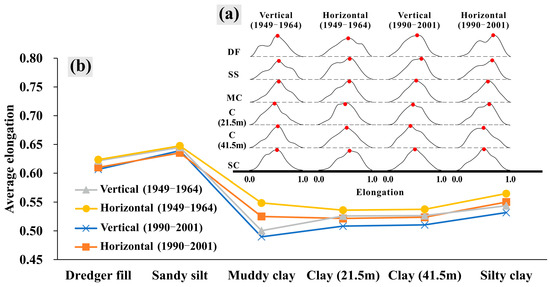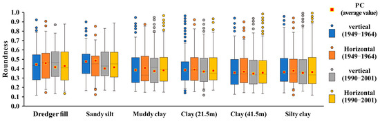Soil permeability can be affected by the shape of particles. Abundance is used to identify the shape of soil particles, which is defined as the ratio of short to long axes of particles or units [17,53]. Statistical results of soil particle abundance are shown in Figure 11a,b. In Figure 11a, it can be observed that the abundance of most particles generally follows the normal distribution pattern. The dominant abundance in USC is always concentrated around 0.5, while the dominant abundance range of dredger fill and sandy silt seems to be more extensive, exhibiting “multi-peak”-type (e.g., DF-Vertical-1949~1964; DF-Horizontal-1990~2001) or “platform”-type (e.g., SS-Horizontal-1949~1964; SS-Horizontal-1990~2001) distribution. In Figure 11b, the average abundance of dredger fill and sandy silt is found to be higher than that of USC. This suggests a positive correlation between abundance and particle size, that is, the coarser the particles, the larger the abundance. Moreover, the average abundance of vertical and horizontal particles in the same stage of the dredger fill and sandy silt is approximately equal. However, the abundance of USC horizontal particles is slightly higher than that of vertical particles; this finding is consistent with the fact that particle abundance can be used as a reference for sorting the strength of permeability in different directions [54].
