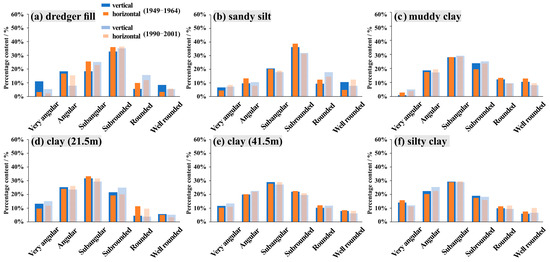 Furthermore, changes in particle abundance resulting from time effects have distinct characteristics [55]. Inland samples have a higher average particle abundance compared with offshore samples, but this difference is not significant in dredger fill and sandy silt. Although the shape of the particles is more influenced by their original source area (and properties) than their migration history, the limited variation in this attribute is believed to be inherently related to the content of small particles in sediment [56]. USC, which has a larger burial depth and an increase in clay content compared with dredger fill and sandy silt, provides a higher water-head gradient internally under saturated conditions. With an increase in sedimentation time, the shape of large particles is subjected to strong hydraulic erosion, and the collision between migrated small particles causes great wear on the external morphology. Xu et al. [57] also suggested that changes in particle morphology caused by mechanical collisions may be related to high gradient hydraulic pressure. Particle migration distance is another factor that cannot be ignored. USC has a larger sedimentary thickness, and due to the increase in particle shape sorting and the migration distance, the particle morphology undergoes significant changes under a hydraulic drive. This is another important reason why the difference in the vertical and horizontal abundance of USC is higher than that of dredger fill and sandy silt.