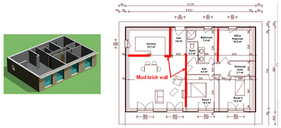 - In the “earth” version, the earth brick wall replaces certain partition walls over a surface area of 30.8 m², with the other assumptions remaining identical to the basic version.