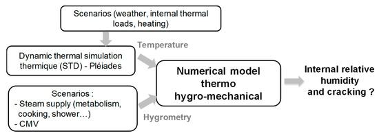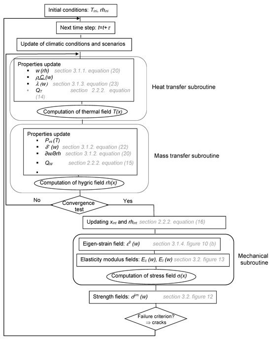 Figure 4 presents the approach adopted to develop the coupled hygro-thermo-mechanical model. The algorithm was implemented in the Gibiane language within the Cast3M finite element environment [40]. The resolutions when calculating the T(x) or rh(x) fields at each time step use conventional transient thermal operators with a relaxation parameter θ = 1. The numerical processing of the coupled transfer consists of solving the thermal equation and then the water equation at each time step. This process is repeated iteratively in updating the physical properties (thermal and vapor conductivity, heat and water capacity, etc.) as well as the saturation vapor pressure and source terms after each solution. This iterative process was repeated until reaching convergence, which occurred when the variation in each unknown (temperature and humidity) between two iterations was below a given threshold. Next, the mechanical stress field generated by the shrink-swell deformations was determined for each time step and compared with both the tensile and compressive strengths obtained through experimentation to detect crack occurrence.