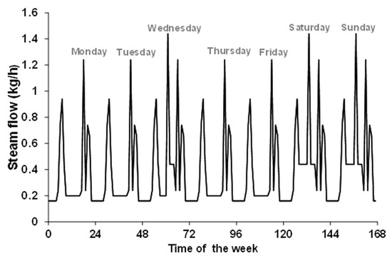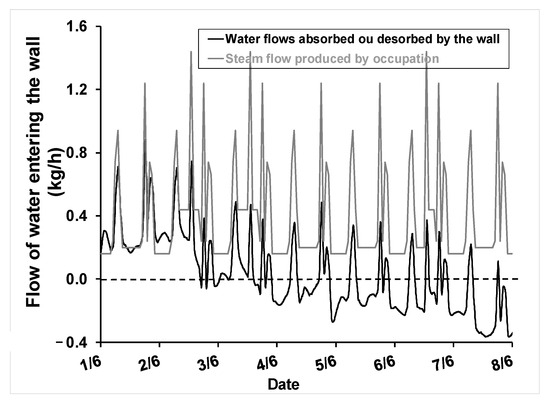 The scenario for occupancy and use of the dwelling corresponds to a family of 4 and reproduces the standard routine for a work week throughout the year, as defined in the Th-BCE rules of RT2012 [22]. The steam production scenario takes into account the occupants’ metabolism and steam emissions from various domestic activities (cooking, washing, drying clothes, etc.). Table 1 and Figure 3 summarize the daily steam production vs. day of the week input into the numerical simulation. The heating temperature set-point scenario accounts for intermittent heating during unoccupied hours. The dwelling is not air-conditioned in the summer. The ventilation scenario applied corresponds to constant airflow ventilation (CAV) with a manual low/high flow switch in the kitchen. Flow rates comply with the regulatory values listed in the 1982 decree. Not taken into account herein are infiltration, nighttime over-ventilation, and window openings.