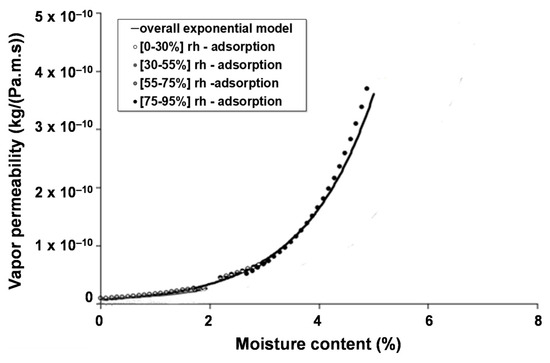 According to preliminary research [45], it is possible to fit the apparent vapor permeability to an exponential law defined in Equation (21).