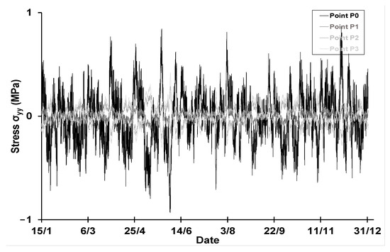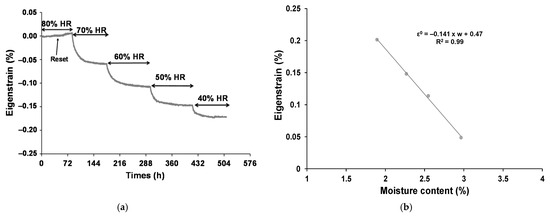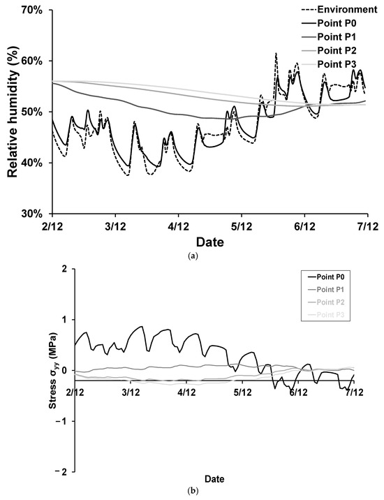 The water expansion tensor is defined as a function of both the coefficient of water expansion and the moisture content of the material. The thermal expansion tensor is similarly defined. These models make it possible to accurately predict the onset of pathologies linked to dimensional variations [38]. Gonzalez proposed a more simplistic approach [39]: the stress exerted by water on the solid matrix for the various wetting and drying cycles is determined by Equation (2).