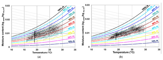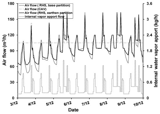 As explained in Section 2.1, the ambient relative humidity is an unknown that can be determined by a balance equation on the humidity of the area. The evolution of specific ambient humidity is calculated step-by-step from a water balance equation for air in the zone [Equation (16)].