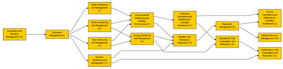 The applications with lower dependent power can be carried out relatively independently. For example, corresponding to the graphical position of energy management (4) with a relatively balanced driving power and dependence power and slightly lower dependency (higher automation) suggests that energy monitoring can be easily conducted irrespective of whether other BIM-FM functions are adopted. In addition to energy, monitoring of environment (3), solar (5), airflow (6), and security (11) may have the flexibility to be provisioned individually based on each healthcare facility’s needs without concerns of their dependencies on other monitoring functions.